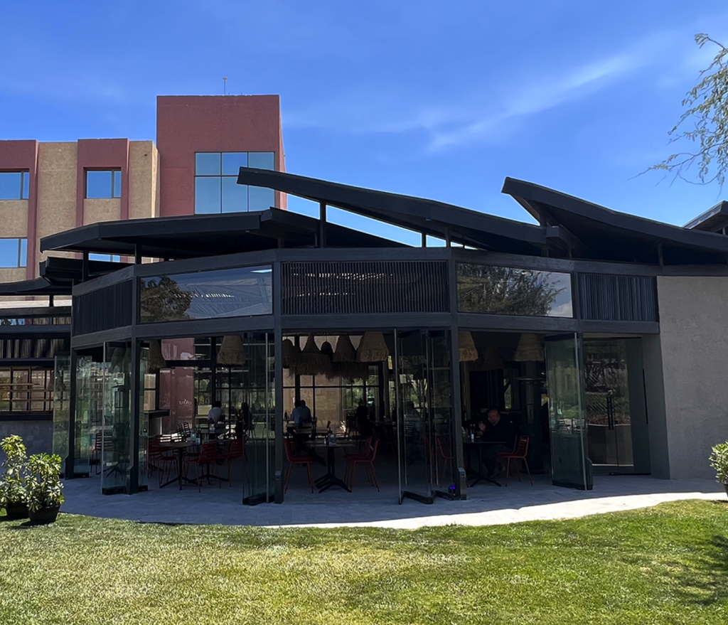 Diseñamos una terraza que sirve como espacio intermedio, ofreciendo un lugar de descanso y esparcimiento para los huéspedes.